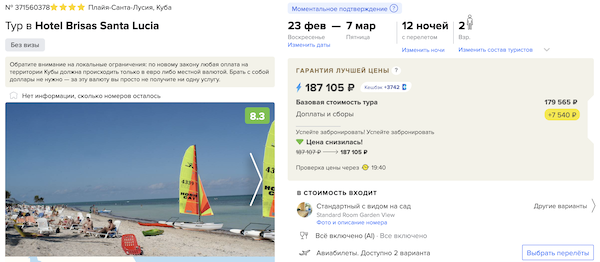 Hotel Brisas Santa Lucia 4* 93.500 рублей за человека (187.100 рублей за двоих)