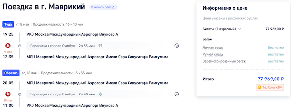 Из Москвы на Маврикий 78.000 рублей туда-обратно.