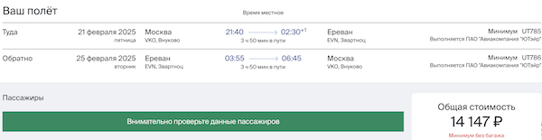 Из Москвы в Ереван в феврале 14.100 рублей туда-обратно.