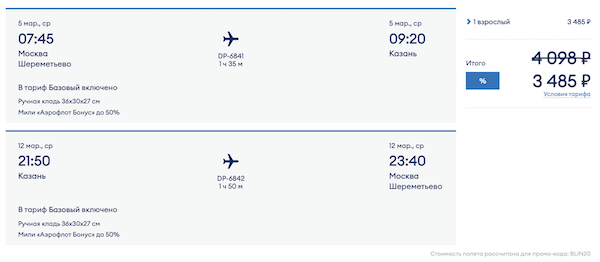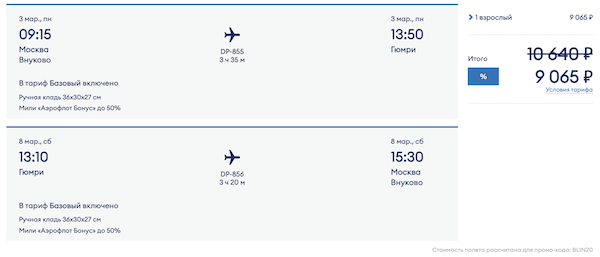У авиакомпании Победа распродажа: по промокоду BLIN20 скидка 15-20% на все рейсы до конца октября.