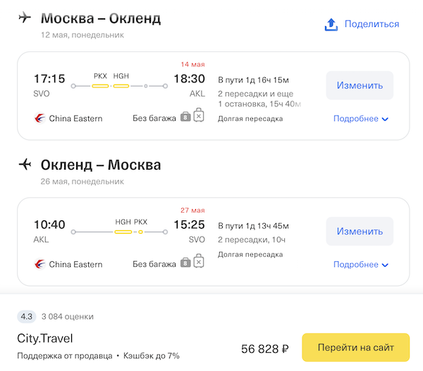 Рейсы выполняются China Eastern с двумя пересадками: в Пекине и Ханчжоу.