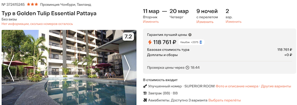 Golden Tulip Essential Pattaya 3* с завтраками 59.400 рублей за человека (118.800 рублей за двоих)