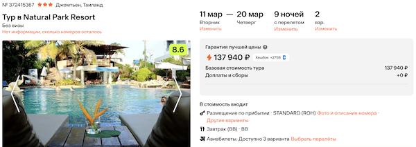 Natural Park Resort 3* с завтраками 68.900 рублей за человека (137.900 рублей за двоих)