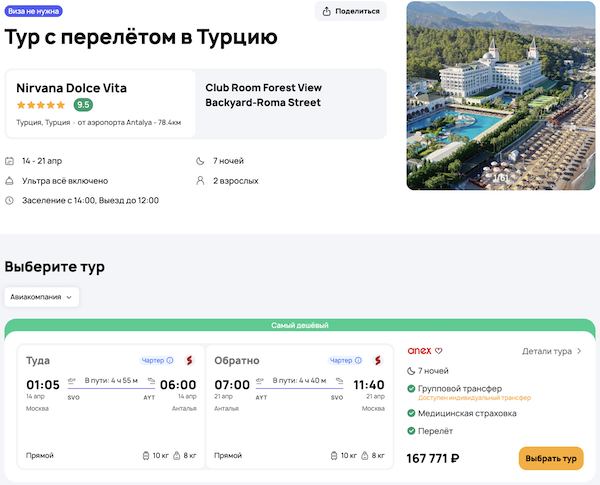 Nirvana Dolce Vita 5* ультра все включено 83.900 рублей за человека (167.800 рублей за двоих)