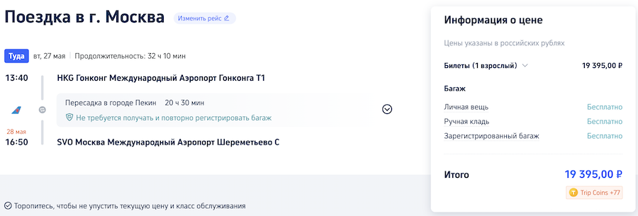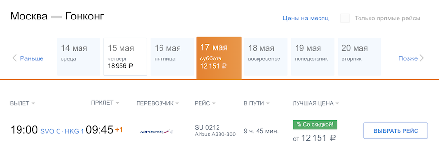 Из Москвы в Гонконг в мае: 12.200 рублей в одну сторону, 31.500 туда-обратно.