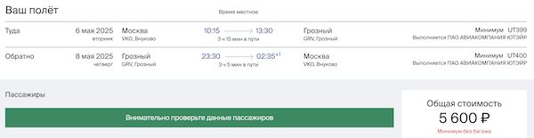 Из Москвы в Грозный в начале мая 5.600 рублей туда-обратно.