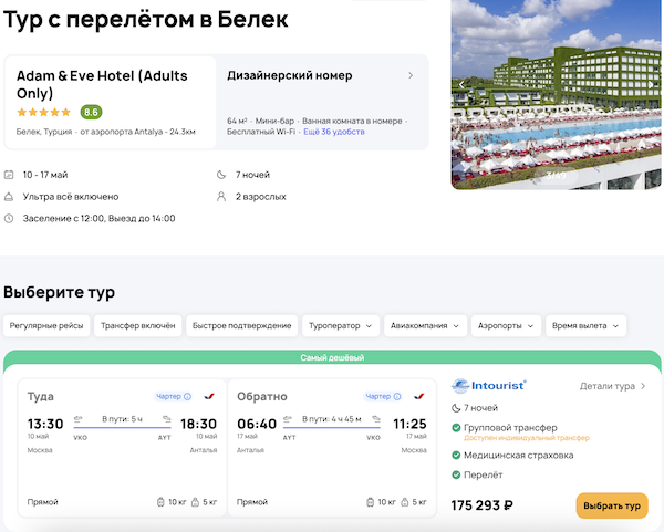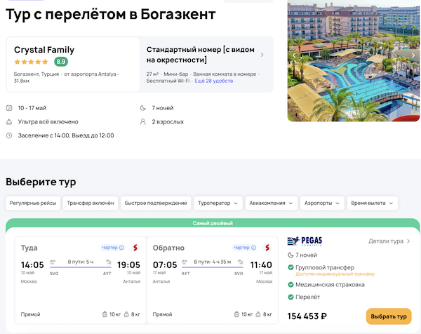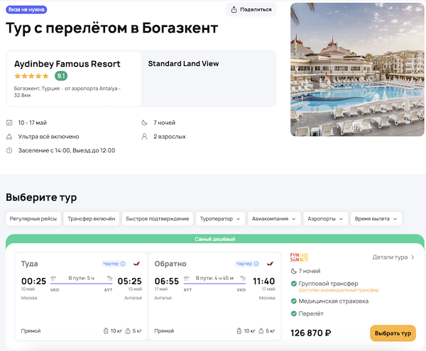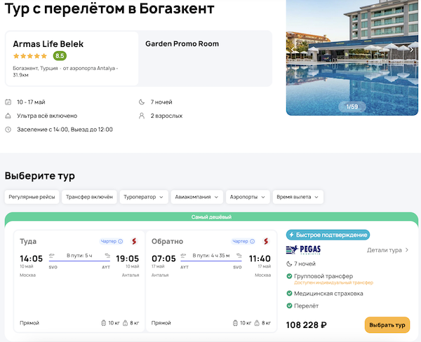 — прямой перелет в Анталью и обратно;