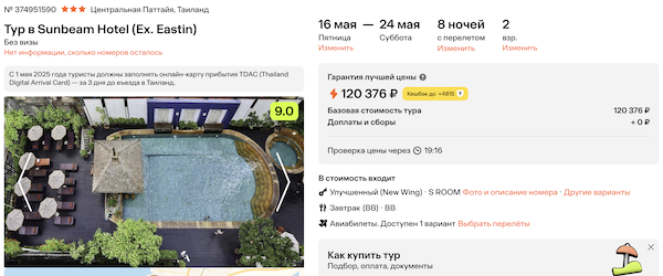 Sunbeam Hotel 3* с завтраками 60.200 рублей за человека (120.400 рублей за двоих)