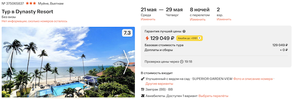 Dynasty Resort 3* с завтраками 64.500 рублей за человека (129.000 рублей за двоих)