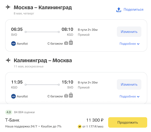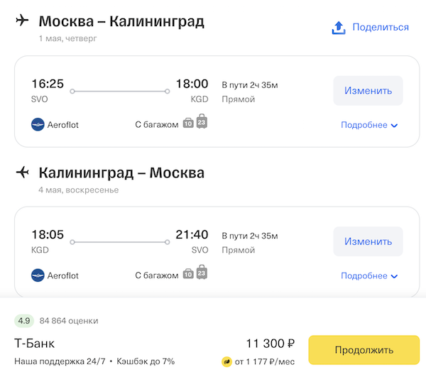 Аэрофлот: из Москвы в Калининград на пиковые даты майских праздников 11.300 рублей туда-обратно.