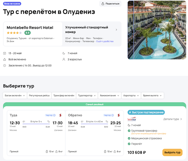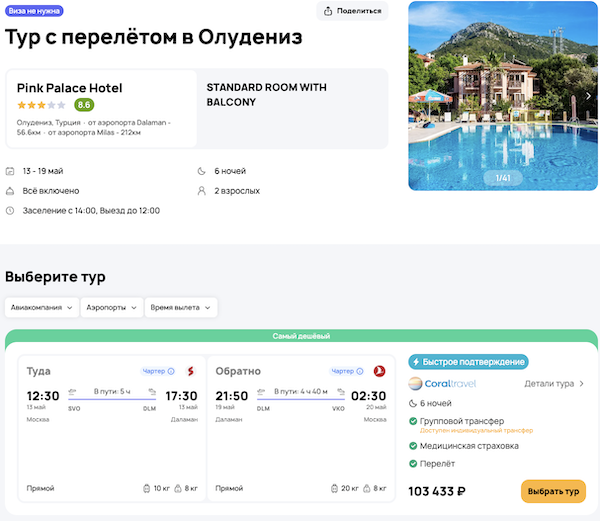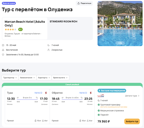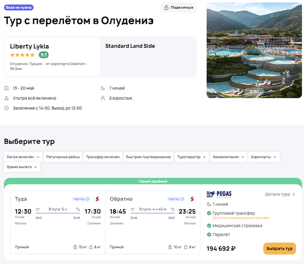 Туры из Москвы в Олюдениз в середине мая от 39.700 рублей за человека.