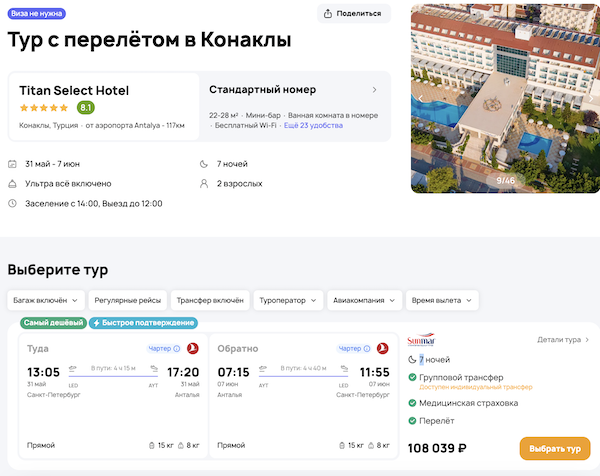 Titan Select Hotel 54.000 рублей за человека (108.000 рублей за двоих)