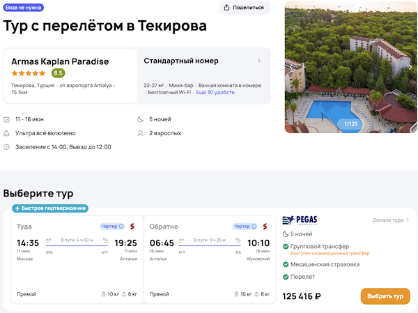 Armas Kaplan Paradise ультра все включено 62.700 рублей за человека (125.400 рублей за двоих)