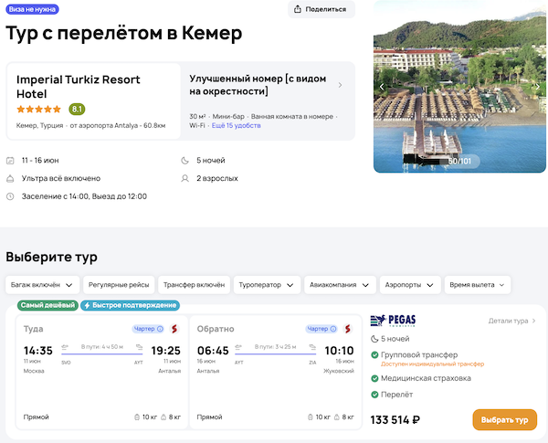 Imperial Turkiz Resort Hotel ультра все включено 66.700 рублей за человека (133.500 рублей за двоих)