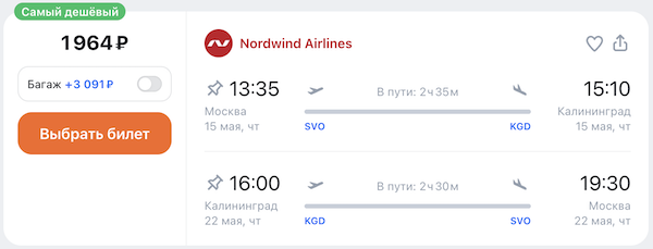 Горящие билеты из Москвы в Калининград: 1.000 рублей в одну сторону, 1.900 туда-обратно.