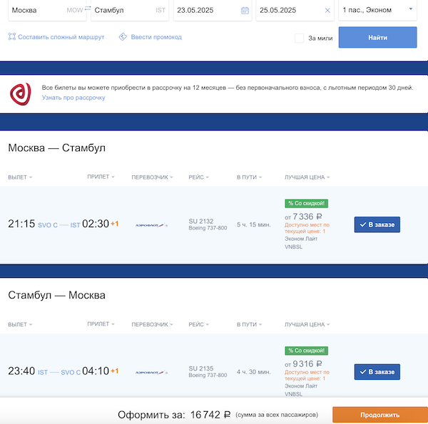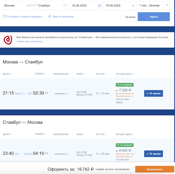 У Аэрофлота много билетов в мае за 16.700 рублей туда-обратно, в том числе на выходные: