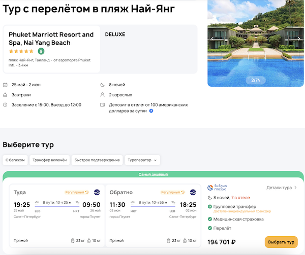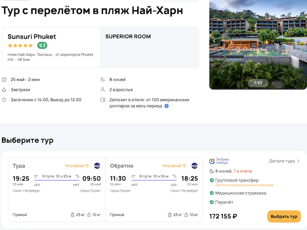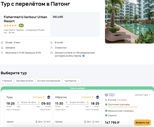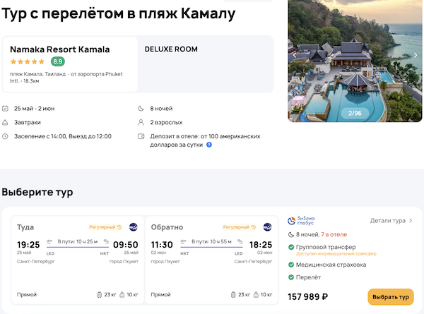 Туры из Санкт-Петербурга в Таиланд: прямой перелет на Пхукет, трансферы и неделя в 5* отеле от 73.900 рублей за человека.
