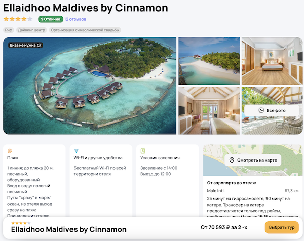 Например, 7 ночей в Ellaidhoo Maldives by Cinnamon 4* (двухместный номер) 70.600 рублей с завтраками, 85.800 с завтраками и ужинами, 97.700 с завтраками, обедами и ужинами.