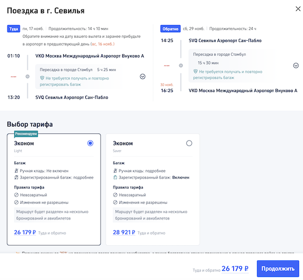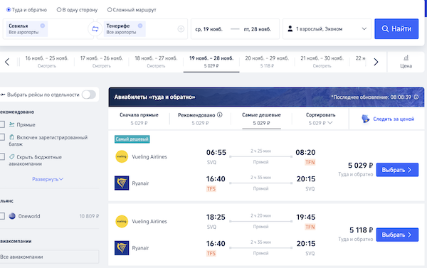 Период путешествия: из Москвы в Севилью много дат в ноябре. Из Севильи на Тенерифе минимальная цена на любой день в ноябре.