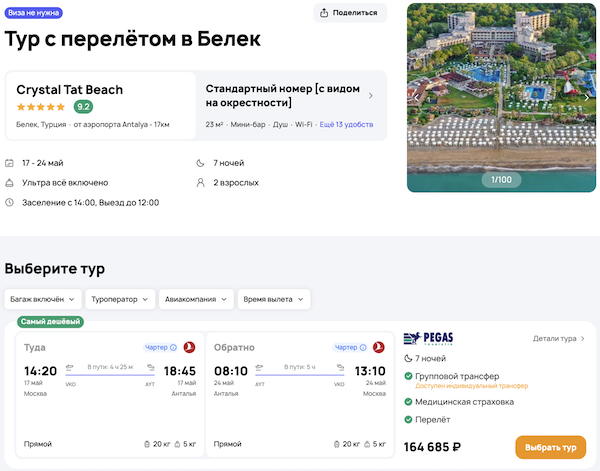 Crystal Tat Beach 82.300 рублей за человека (164.700 рублей за двоих)