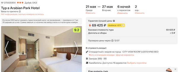 Arabian Park Hotel 3* с завтраками 34.700 рублей за человека (69.400 рублей за двоих)