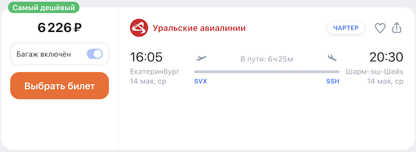 Екатеринбург — Шарм-эш-Шейх 14 мая