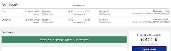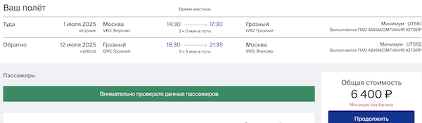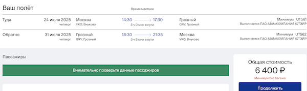 Из Москвы в Грозный летом 6.400 рублей туда-обратно.