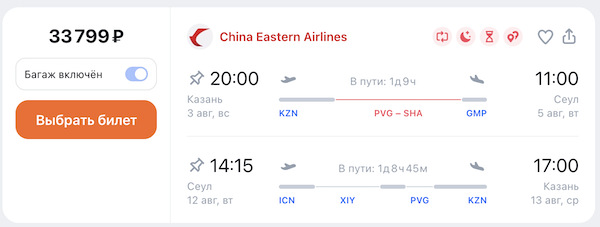 Билеты из Казани в Сеул летом 33.400 рублей туда-обратно.