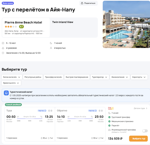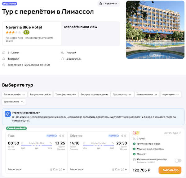 Туры из Москвы на Кипр в июле от 43.800 рублей за человека.