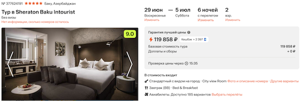 Sheraton Baku Intourist 5* с завтраками 59.900 рублей за человека (119.900 рублей за двоих)