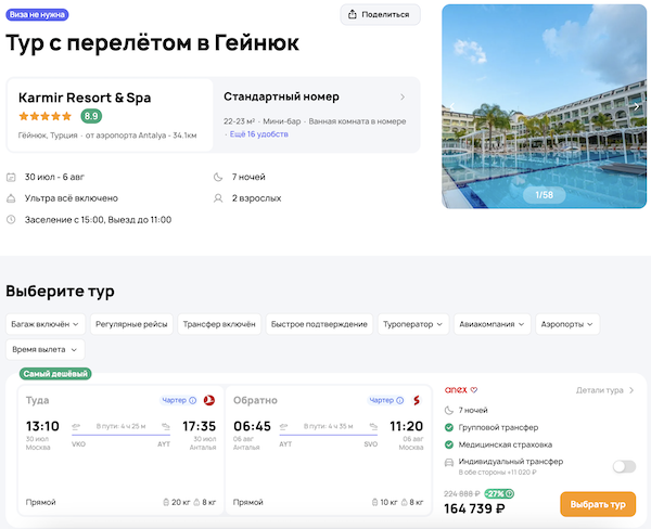 Karmir Resort & Spa 82.300 рублей за человека (164.700 рублей за двоих)