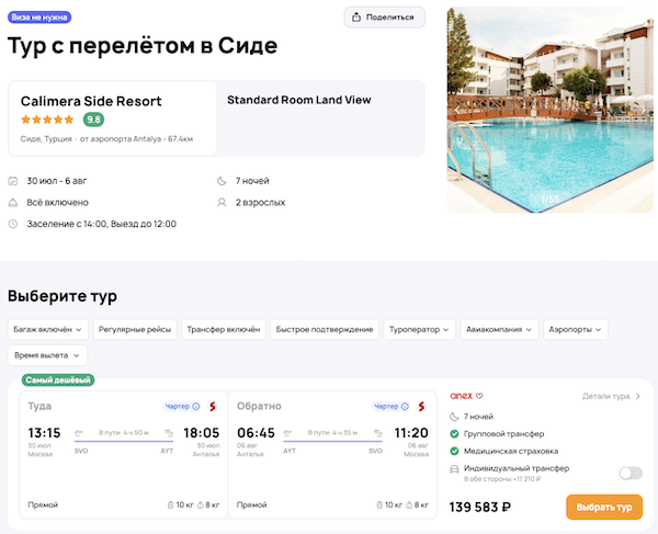 Calimera Side Resort 69.800 рублей за человека (139.600 рублей за двоих)