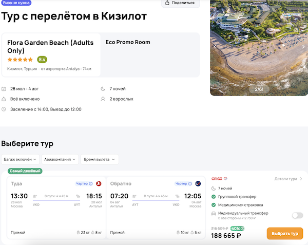 Flora Garden Beach 94.300 рублей за человека (188.700 рублей за двоих)