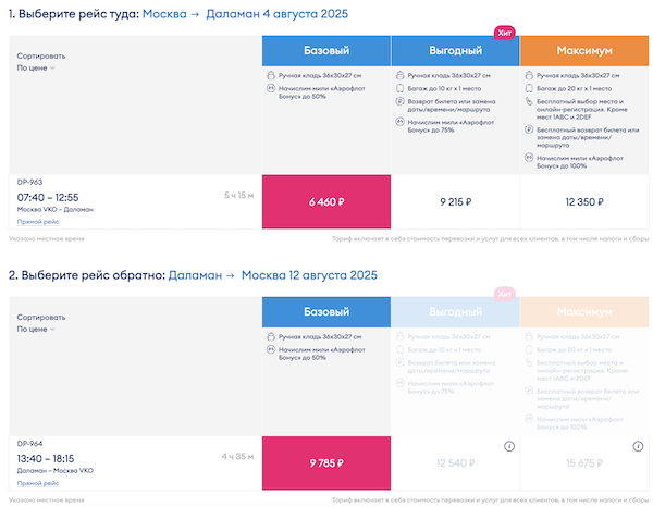 Из Москвы в Даламан в августе 16.200 рублей туда-обратно.