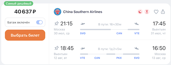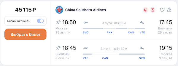 Рейсы выполняются авиакомпанией China Southern с пересадкой в Гуанчжоу (и дополнительной стыковкой в Пекине по дороге в Москву).