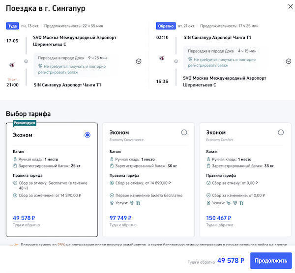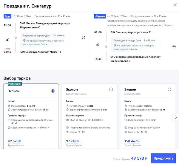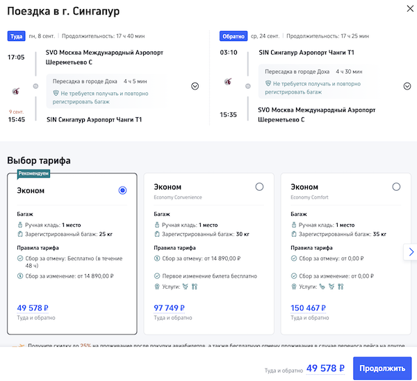 Qatar Airways: билеты из Москвы в Сингапур от 49.600 рублей туда-обратно.