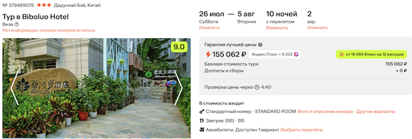 Biboluo Hotel 3* с завтраками 77.500 рублей за человека (155.100 рублей за двоих)