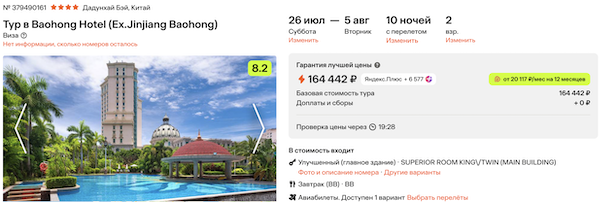 Baohong Hotel 4* с завтраками 82.200 рублей за человека (164.400 рублей за двоих)