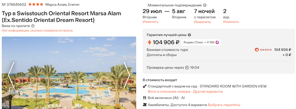 Swisstouch Oriental Resort Marsa Alam 4* 52.400 рублей за человека (104.900 рублей за двоих)