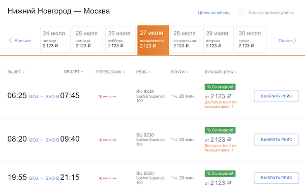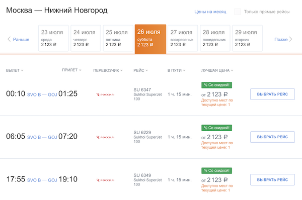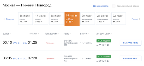 Билеты авиакомпании Россия между Москвой и Нижним Новгородом в июле 4.200 рублей туда-обратно.