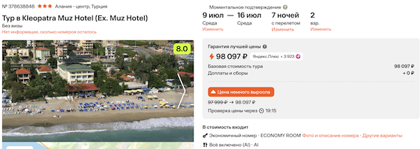 Kleopatra Muz Hotel 3* все включено 49.000 рублей за человека (98.100 рублей за двоих)