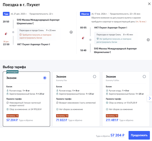 Билеты из Москвы на Пхукет на Новый год 57.200 рублей туда-обратно.