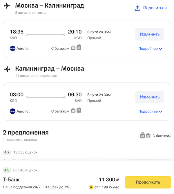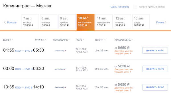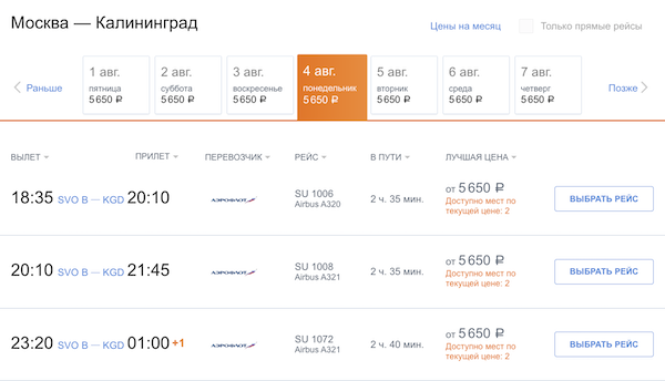 Из Москвы в Калининград летом: Аэрофлот добавил много билетов на август по 11.300 рублей туда-обратно.