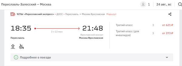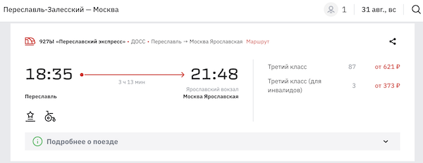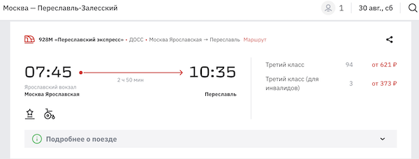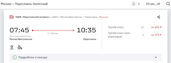 Из Москвы в Переславль-Залесский на выходные в августе 1.200 рублей туда-обратно.