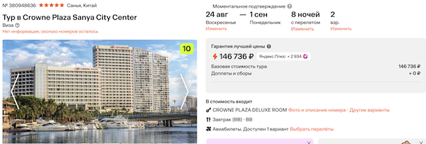 Crowne Plaza Sanya City Center 5* с завтраками 73.300 рублей за человека (146.700 рублей за двоих)