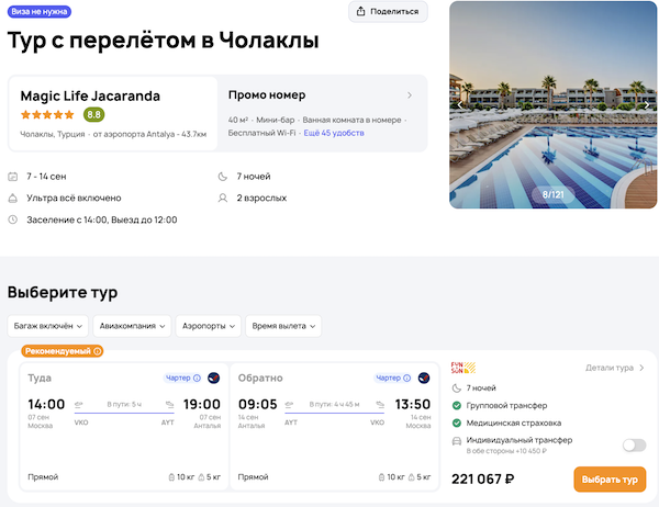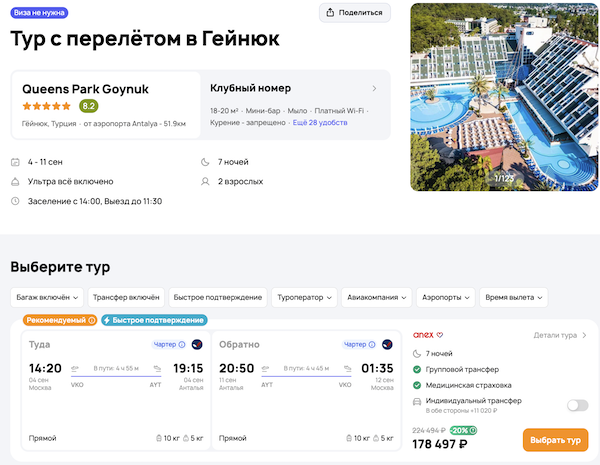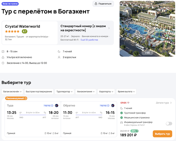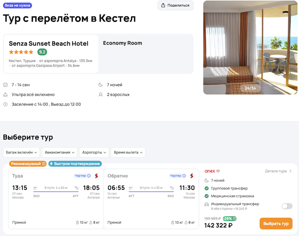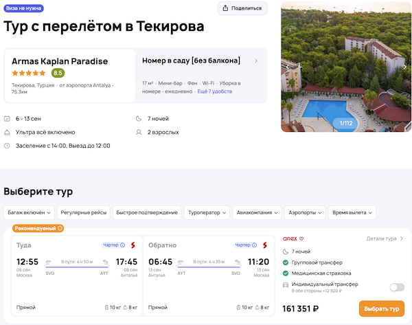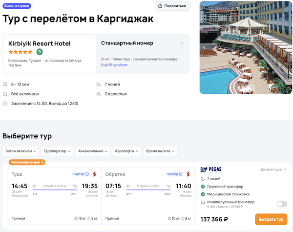 — прямой перелет в Анталью и обратно;