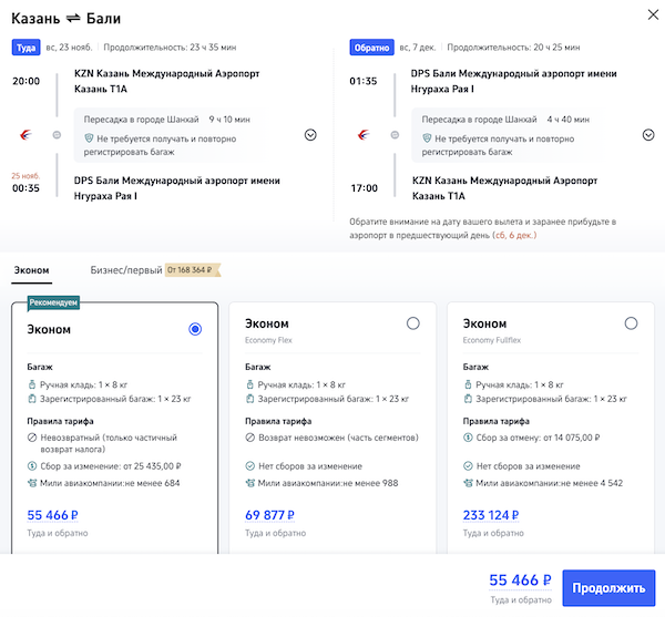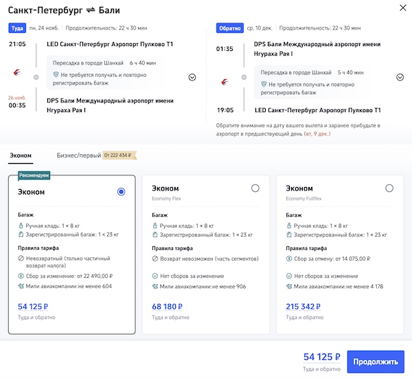Билеты на Бали из Казани и Санкт-Петербурга от 54.100 рублей туда-обратно.