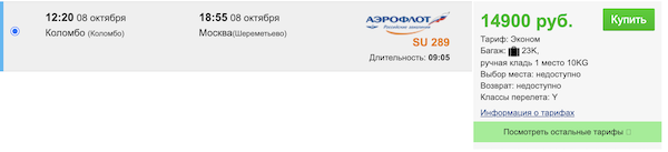 Из Коломбо в Москву прямым рейсом Аэрофлота с включенным багажом.