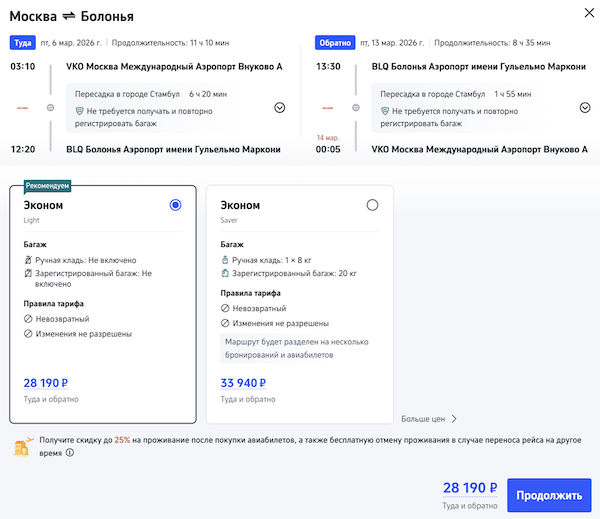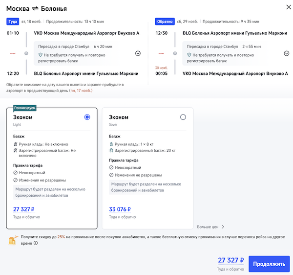 В Италию осенью и весной: билеты из Москвы в Болонью от 27.300 рублей туда-обратно.