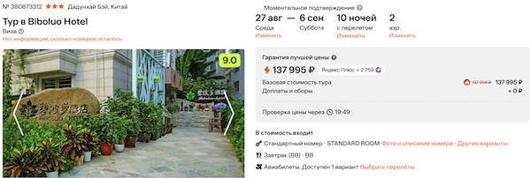 Biboluo Hotel 3* с завтраками 69.000 рублей за человека (138.000 рублей за двоих)